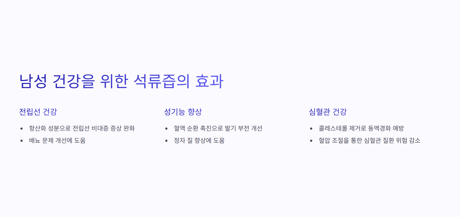 중년 남성들에게 가장 큰 고민 중 하나는 바로 전립선 건강입니다. 석류에 함유된 다양한 성분들은 전립선 건강을 지키고 남성의 활력을 증진시키는 데 도움을 줍니다.