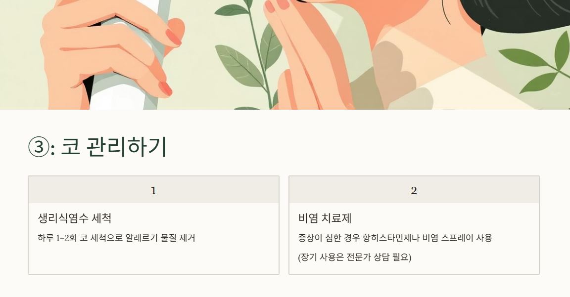 약국에서 판매하는 생리식염수나 스프레이로 하루 1~2회 코를 세척하면 알레르기 유발 물질을 씻어내는 데 도움이 됩니다.